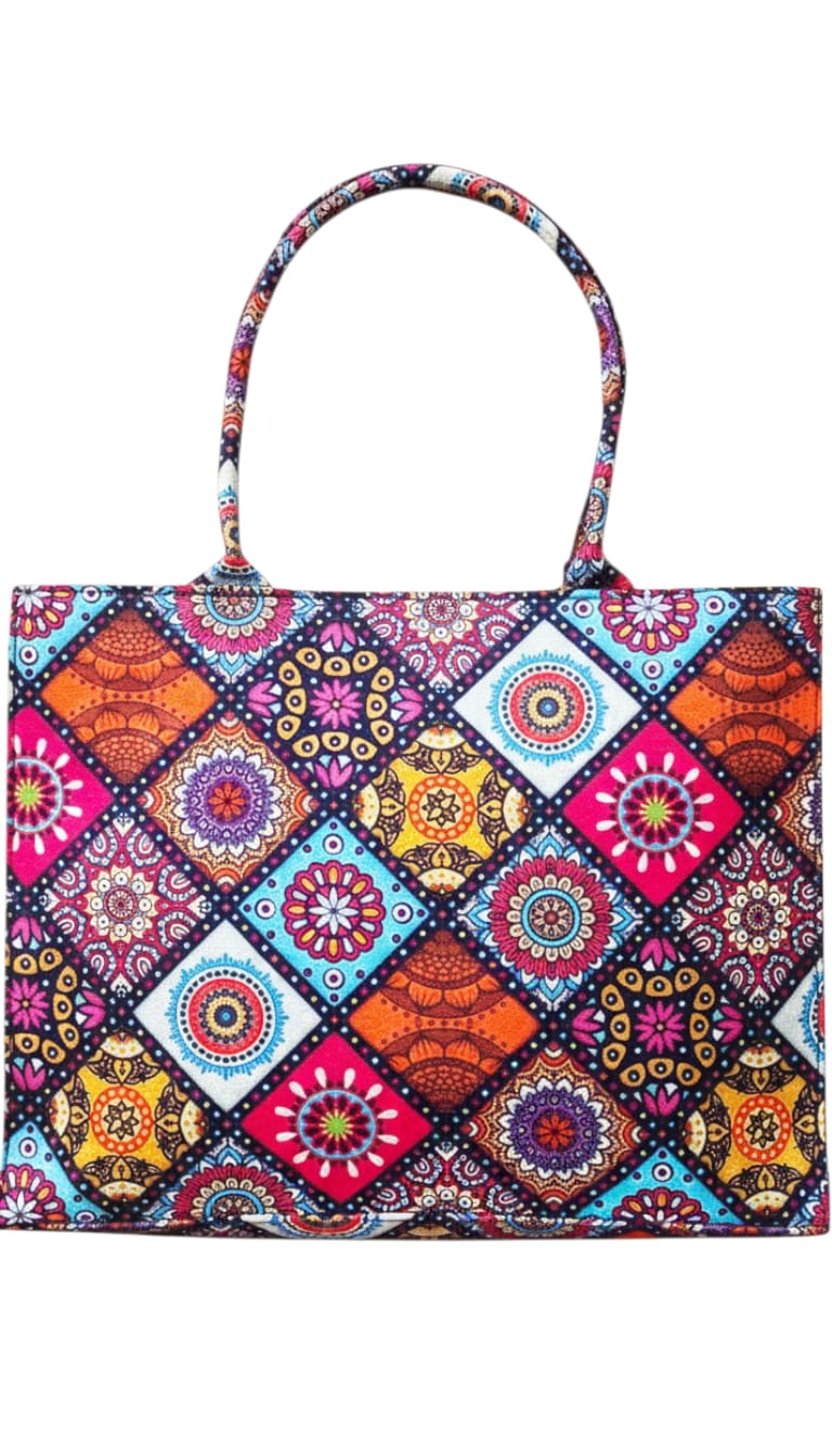 The Rangoli Charm Canvas Tote Bag is a vibrant and stylish accessory that features bold and colorful patterns inspired by traditional rangoli designs. With its bright hues of pink, orange, blue, and purple, this tote adds a playful and artistic touch to any outfit. It's made from durable canvas material, perfect for daily use, shopping, or carrying your essentials to the beach, school, or work.